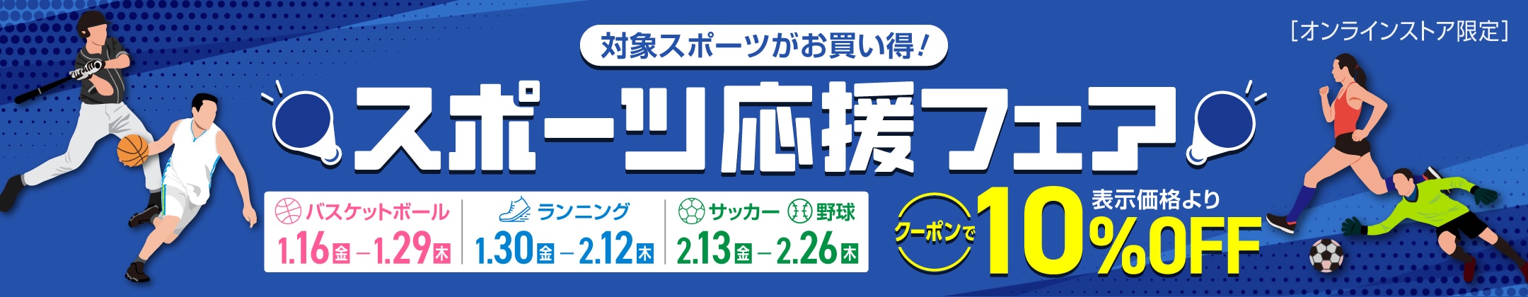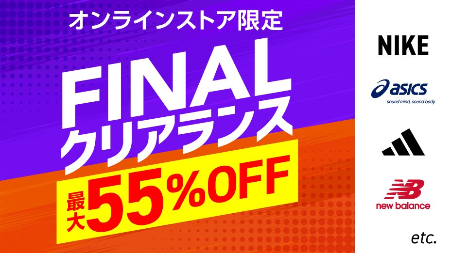 オンラインストア限定で、ランニングシューズなどの人気アイテムが最大50%OFF、ポイント10倍で購入できるセール。
