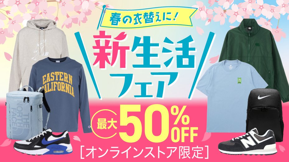 オンラインストア限定で、ナイキ、アンダーアーマー、ノースフェイス、プーマなどが最大50%OFFで購入できるセール。