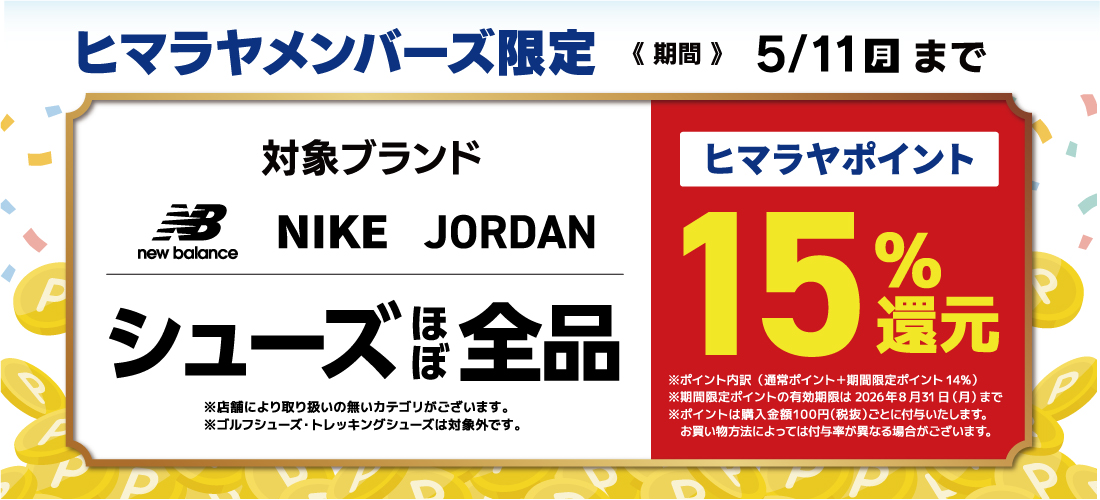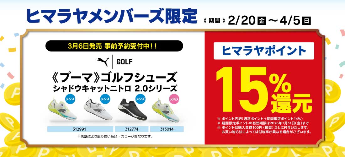 対象のPUMAゴルフシューズを購入すると、ヒマラヤポイントが15%還元されます。