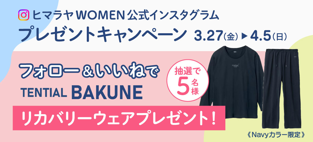 ヒマラヤ公式アカウント【ヒマラヤ WOMEN】をフォローして、本キャンペーン投稿に「いいね」をすると、抽選で5名様に「TENTIAL「BAKUNE Dry 上下セット」が当たります!
