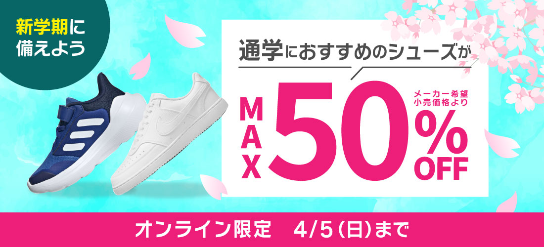 通学におすすめのシューズが、最大50%OFFでお買い得です。新学期に向けて、お気に入りの一足を見つけてみてくださいね。