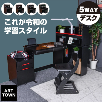 タブレットやプログラミング学習にも対応した5通りに組み替え可能なデスクです。大容量の書棚や引き出し付きワゴンで収納力抜群、勉強や習い事に必要なものをまとめて収納できます。