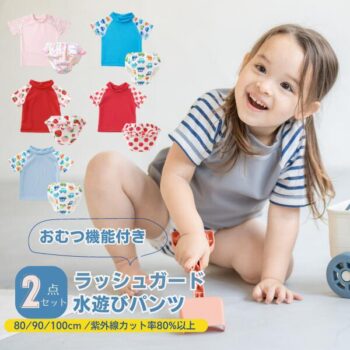おむつ機能が付いた水遊びパンツと、半袖ラッシュガードの2点セットです。かわいらしいデザインの上下セットで、UV80%カットなのもうれしいポイント。日焼け対策ができるベビー用水着を探している方におすすめです。