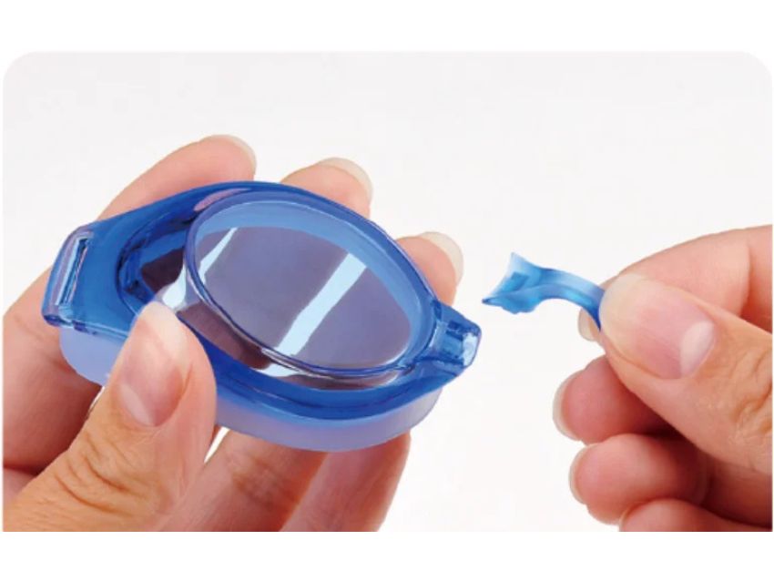 レンズクッションが一体成型で水漏れがしにくい度付きゴーグルです。専用パーツを使用し、簡単に組み立てができます。