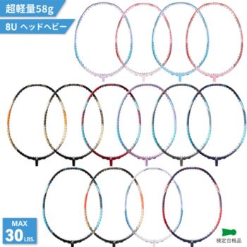 | ラケット重量 | 平均105G以下 | 4U(約83g) | 5U | 6U(72g) | 6U(平均73g) | 8U(約58g) | 4U(約83g) | 5U(平均78g) | 4U(約85g) | 6U(68~72g) | 4U(83g) | 3U(85~89g)、4U(80~84g)、5U(75~79g) |