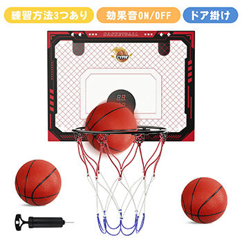 LEDディスプレイ、センサーとスピーカーが搭載されたバスケットボール用ゴールです。シュートが決まるとLEDディスプレイが自動的にカウントし、スピーカーから歓声があがります。ゲーム感覚で楽しく遊べるセットです。
