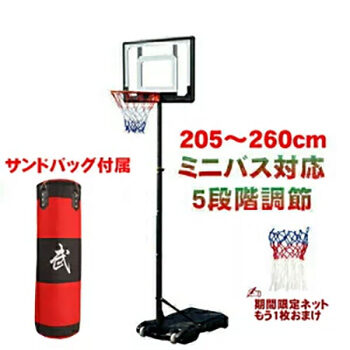 室内にも設置できる比較的コンパクトなミニバス用ゴール。キャスター付きで高さは5段階で調節できます。ベースタンクの安定感を強化するサンドバック(重り)付きです。