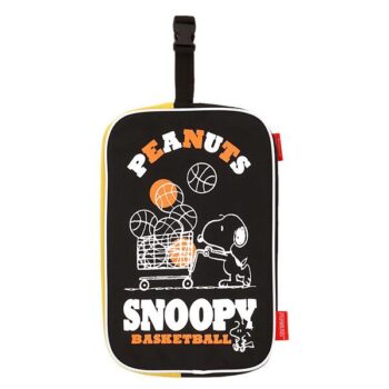 PEANUTSブランドの新作シューズケース。たくさんのバスケットボールが入ったショッピングカートを押すスヌーピーのポップなデザイン。バッシュケースもかわいくしたいミニバス女子におすすめです。