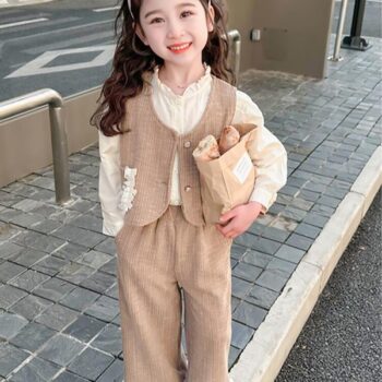 ブラウス、ベスト、パンツの3点が付いたセットアップです。パンツの裾のフリルがアクセントになっています。かわいいパンツスタイルが好きなお子さんにおすすめです。