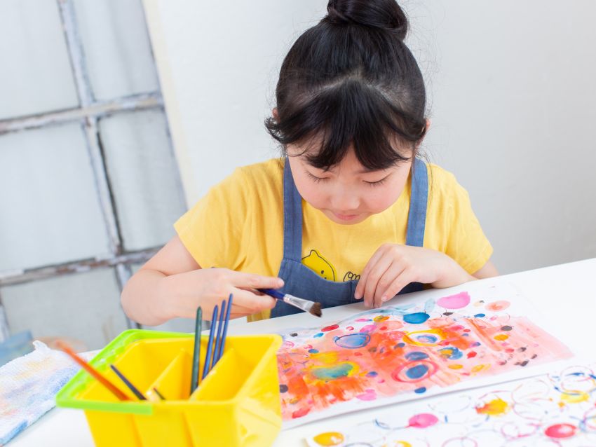 小学生になると、授業や課題の一環として絵の具を使う機会も増えていきます。筆の使い分けや色使いを学ぶ段階なので、自宅でも『道具の扱い方』や『後片づけの習慣』も一緒に身につけていけるとよいですね。