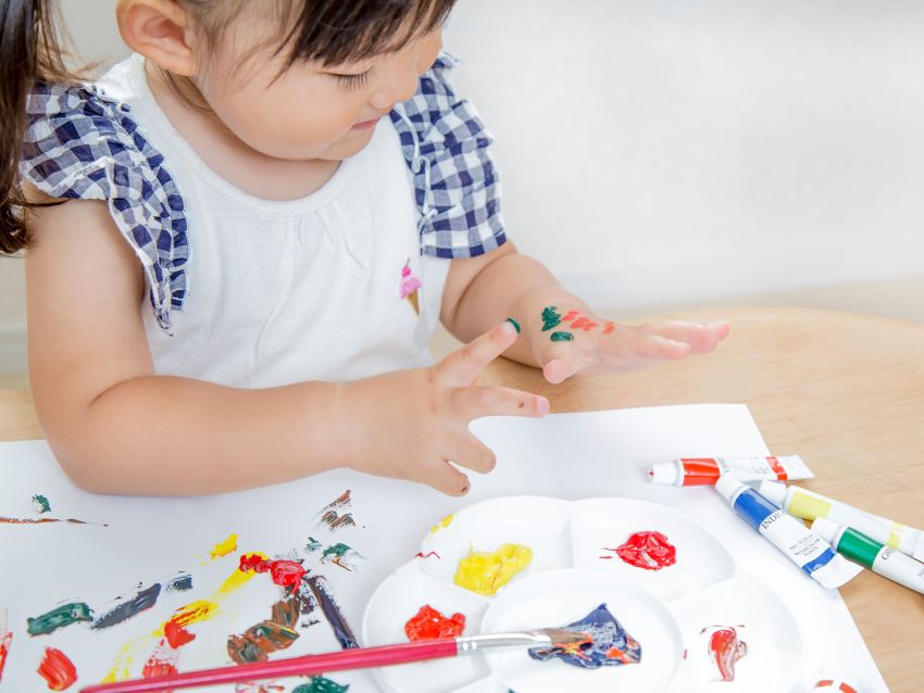 安全性の高い幼児用絵の具を使い、目を離さずに見守ってあげましょう。洋服は汚れてもいいものやスモッグの着用がおすすめです。