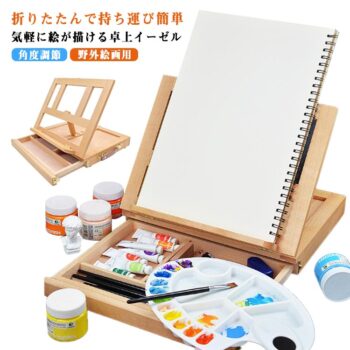 卓上に置いて使いやすい小型タイプのイーゼルです。絵の具や画材が収納可能な引き出しとパレットが付属しています。持ち手付きで移動もラクラク!コンパクトなイーゼルを探している人におすすめです。