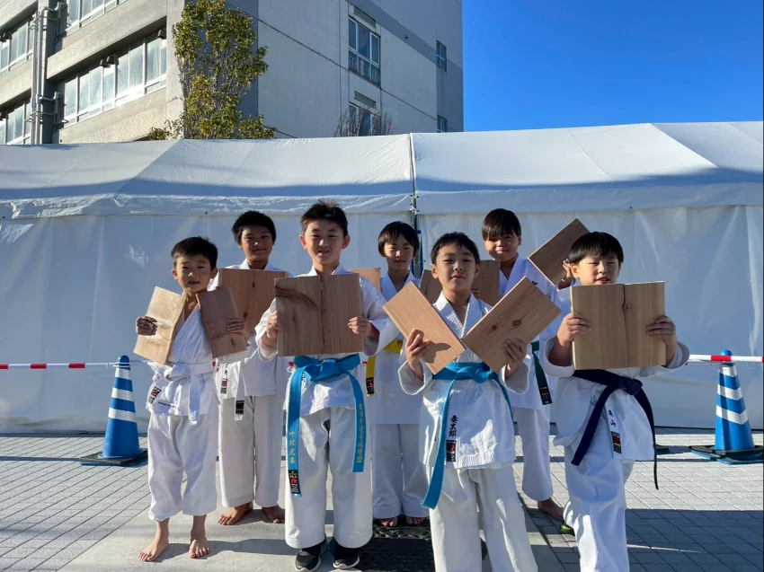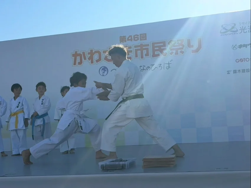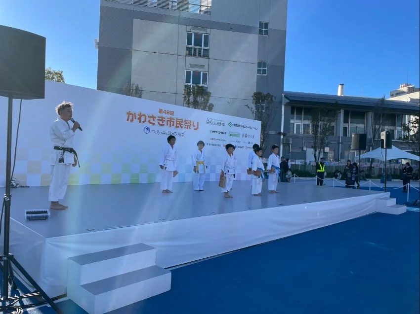 川崎の代表的なお祭りの場で空手の基本動作・形・組手演武と行い、最後に全員で板割りを披露してビシッと終えることができました!