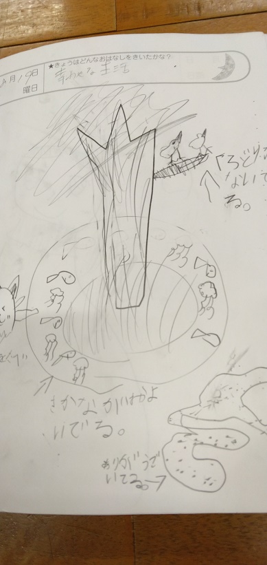 2022.08.20 教室だより 8・19英語と感情 8月19日 音声教材の英語絵本、Rum Pum Pum(ランパンパン)の最後の英語の一行を想像力をもって感情をもって 云う。they have lived happily in their tree ever since(クロドリは幸せにくらしました) クロドリだけでなく仲間となったキャラクタたちの幸せを考えてみたら英語の一行が気持ちを入れての 英語になる。 自分たちのことばに感情をもつことが会話、英語での会話の準備としてそれための活動だから。