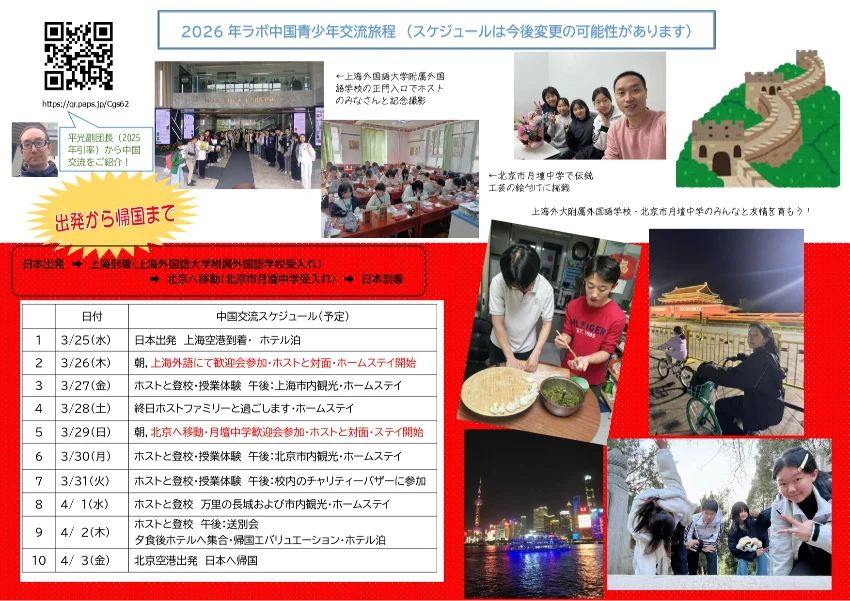 2つの都市を訪問, 学校で授業体験。訪問先は首都北京と最大の経済都市上海の2都市です。