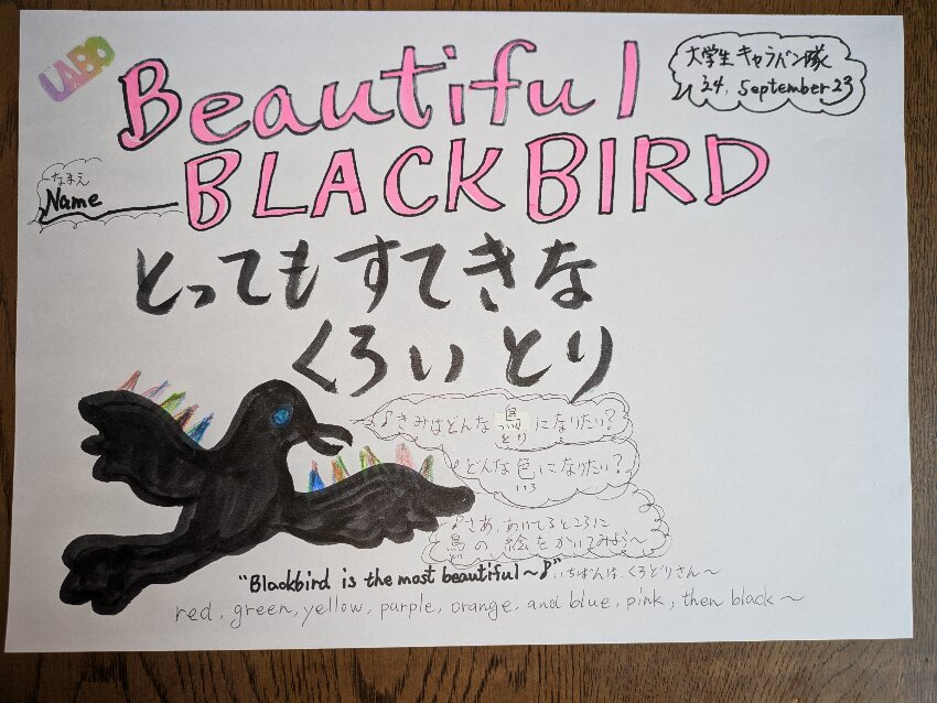 *今日は、23日の「大学生キャラバン隊」に参加しますので、「Beautiful Blackbird-とってもすてきなくろいとり」の絵本を英語日本語で読み聞かせして、続いて内容導入しました。