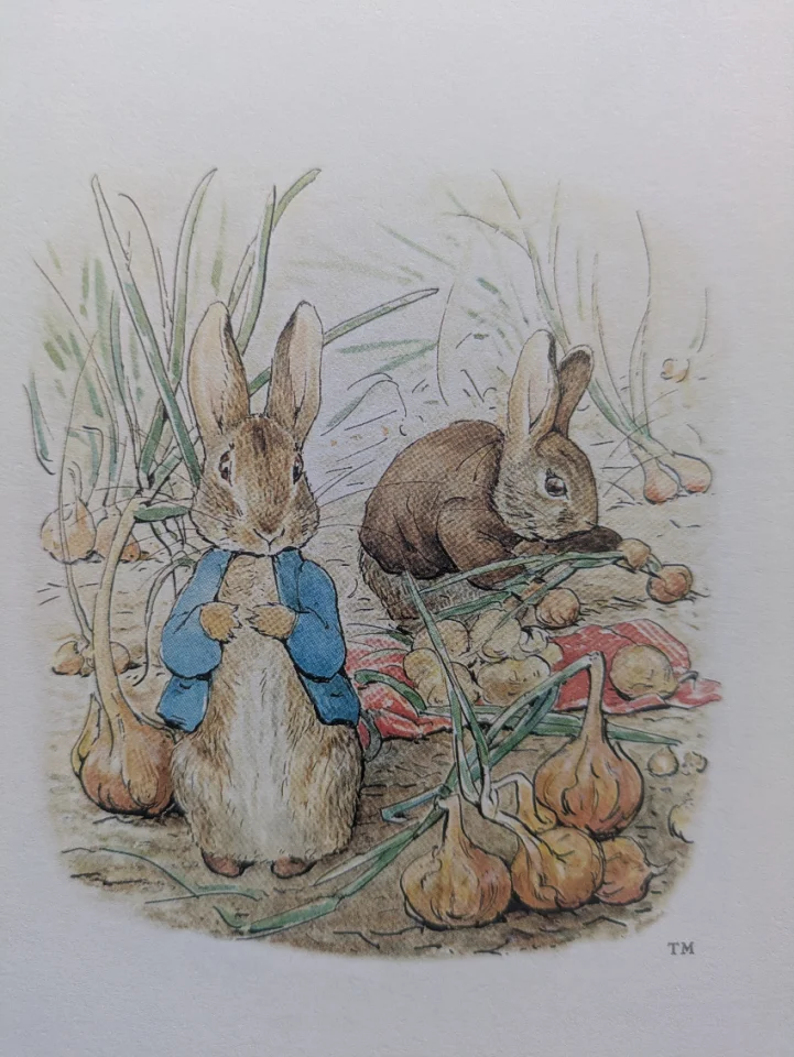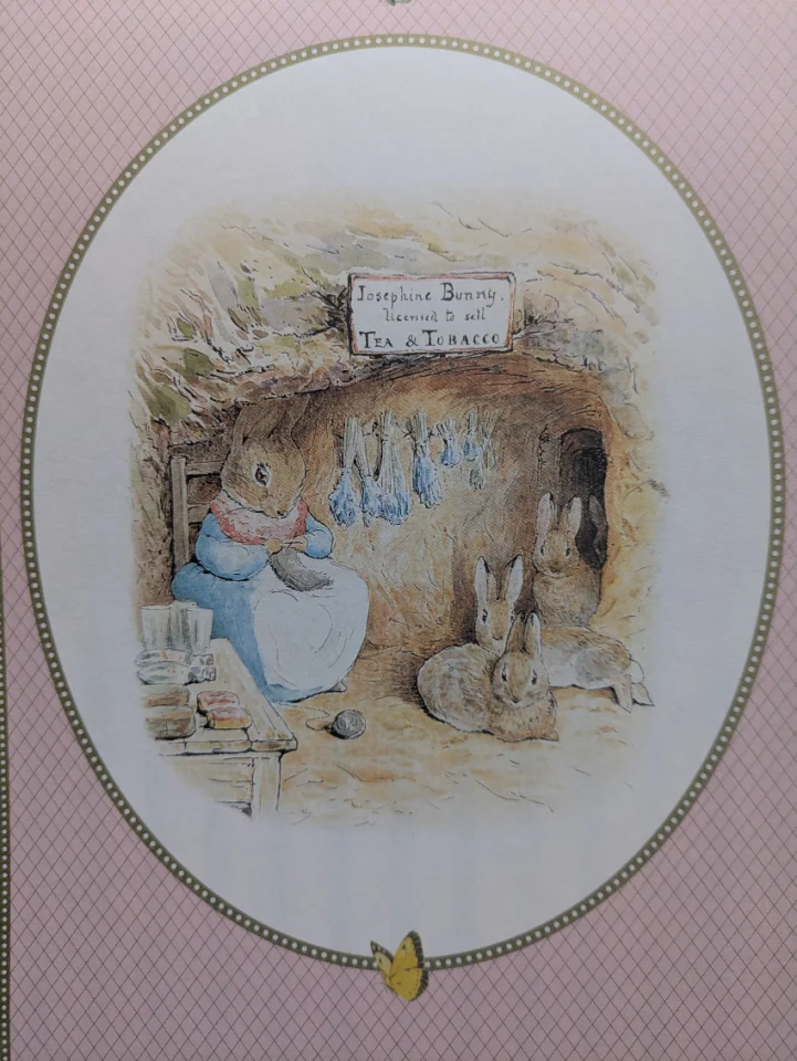 ピーターラビットの世界は、ウサギ世界と人間世界がいつも交差していて表現も面白がってみるといいかも知れません。