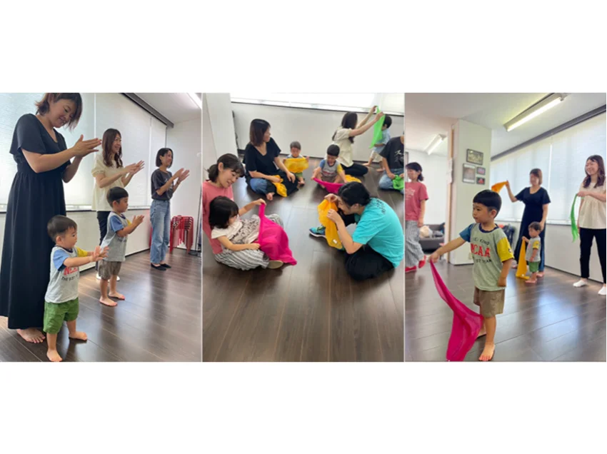 体験会には4組の親子が参加しました。フロアには色とりどりのスカーフが並べてあり、子供たちも始まる前から興味津々!子供たちにとって、緊張なんて言葉はありませんね。