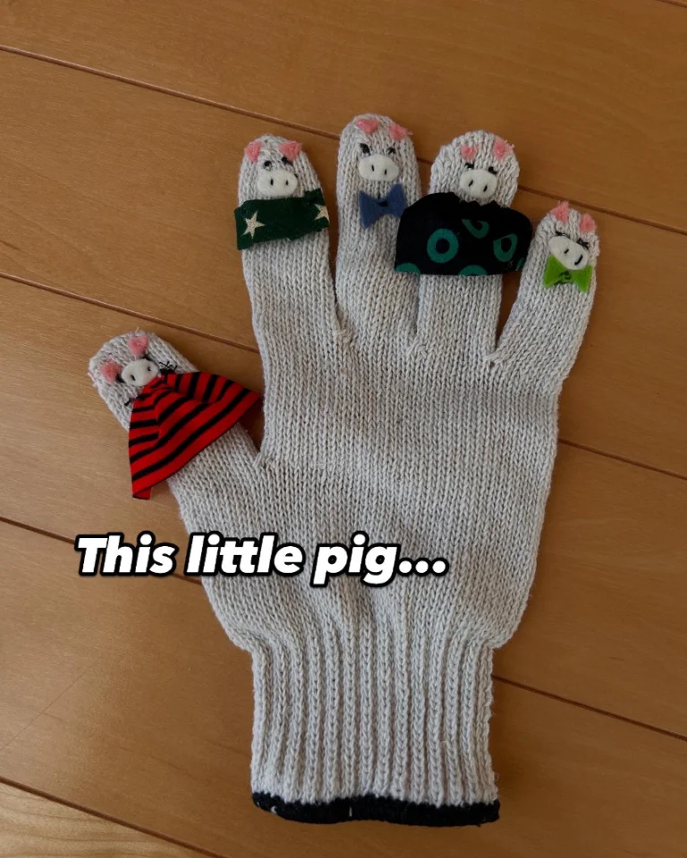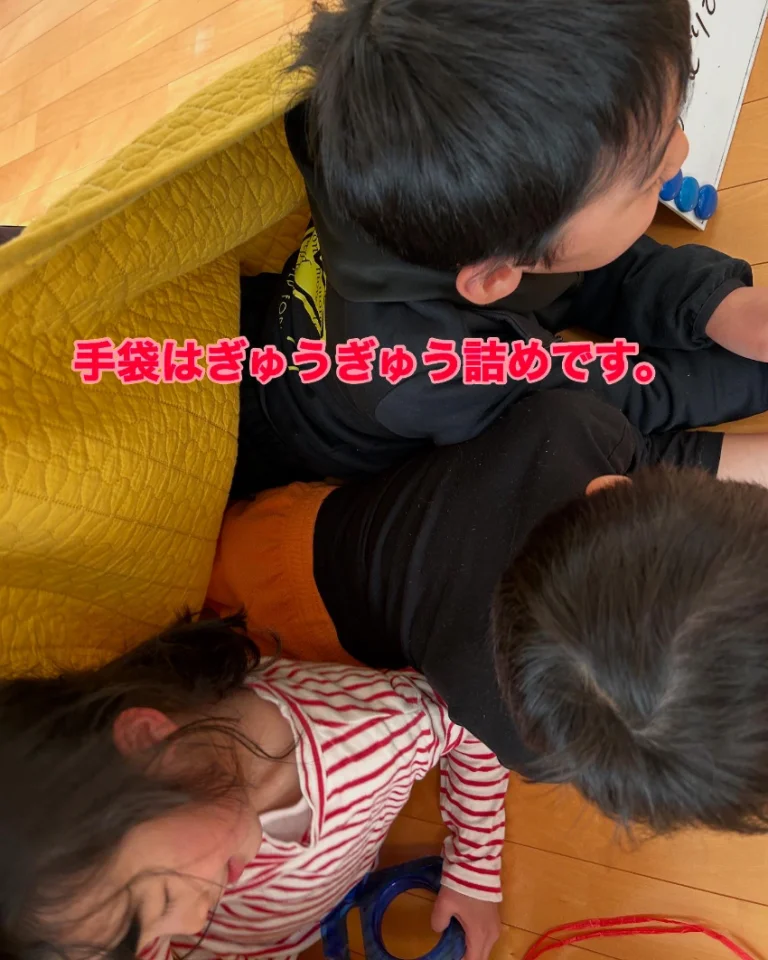 みんな、最後までおはなしの中で遊ぶことができました!てぶくろがぎゅうぎゅう詰め過ぎて、てぶくろに穴が空いて誰かが外に飛び出してしまったり、てぶくろに運び入れた家財道具が倒れてしまったり、きっとこの物語に登場する動物たちも同じようにてんやわんやだったはず。とっても素敵なおはなしごっこでした!