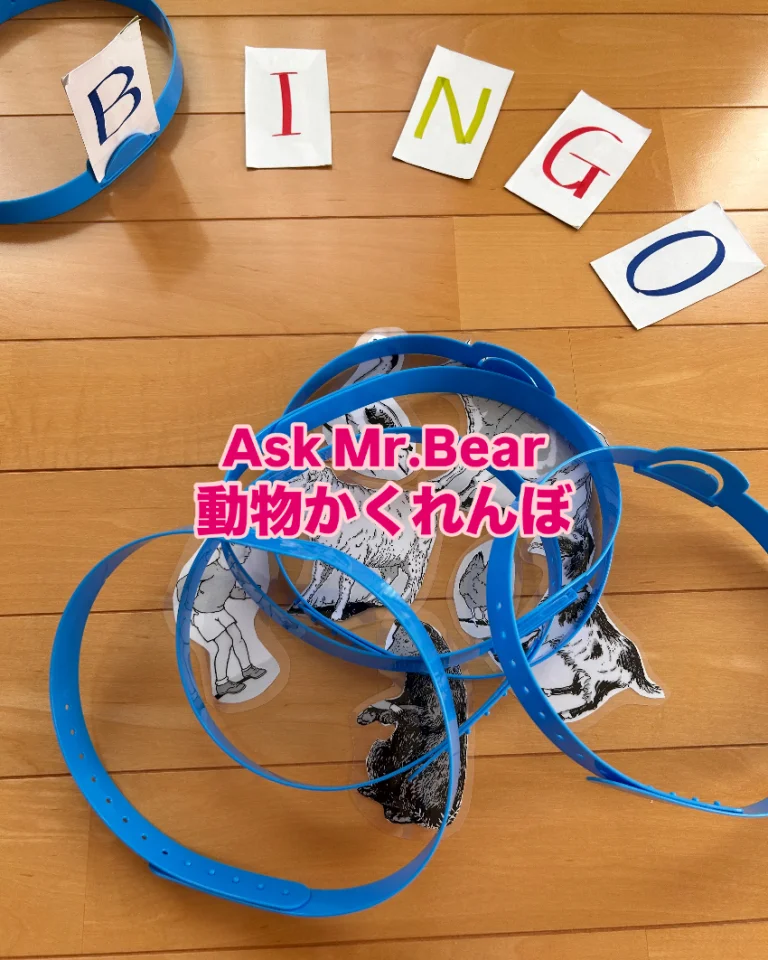 ラボルームに、先々週から取り組んでいるAsk Mr.Bearに登場する動物達を貼り付けてあるのですが、それを使ってかくれんぼしようと。BINGOと、もうひとつソングをやって絵本を読んでからおはなしごっこ(の導入)に入ろうと思っていたのですが、順番がどうであっても大丈夫だろうと思い、提案に乗っかりました。